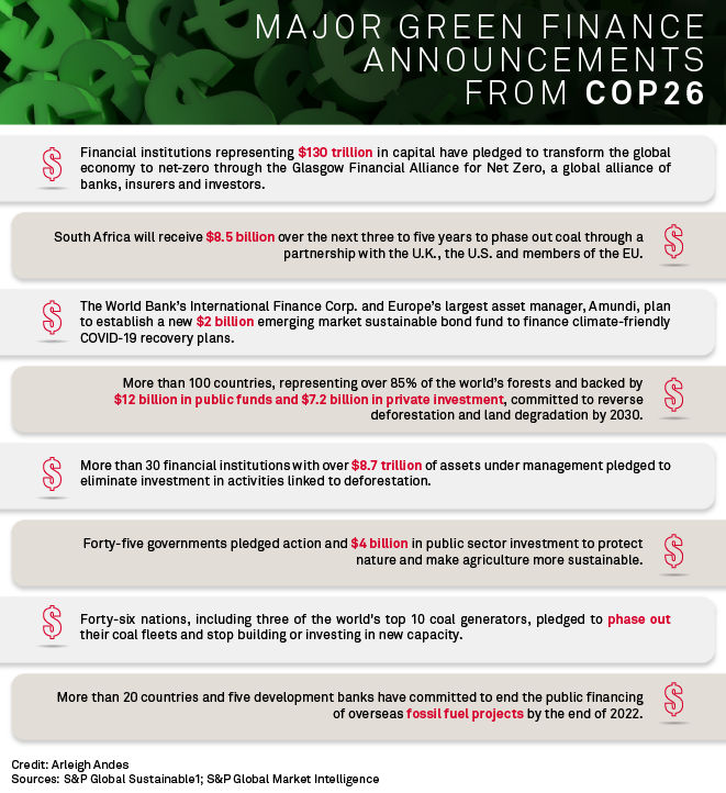 A key theme emerged during the 26th U.N. Climate Change Conference in Glasgow, known as COP26: There is ample supply of financing to tackle the economic impact of climate change, but the world currently lacks the means of getting that money where it’s needed. This means that coordinated action is necessary between the public and private sector to finance the transition and map a new approach to funding and financing climate-friendly projects.