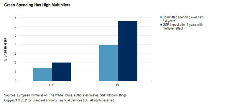 And new research by S&P Global Ratings finds that government spending on green projects in the EU and the U.S. will lift GDP. Government spending on sustainable investments often takes place in infrastructure projects, which attract private sector financing, and green fiscal spending will encourage more private investment.
