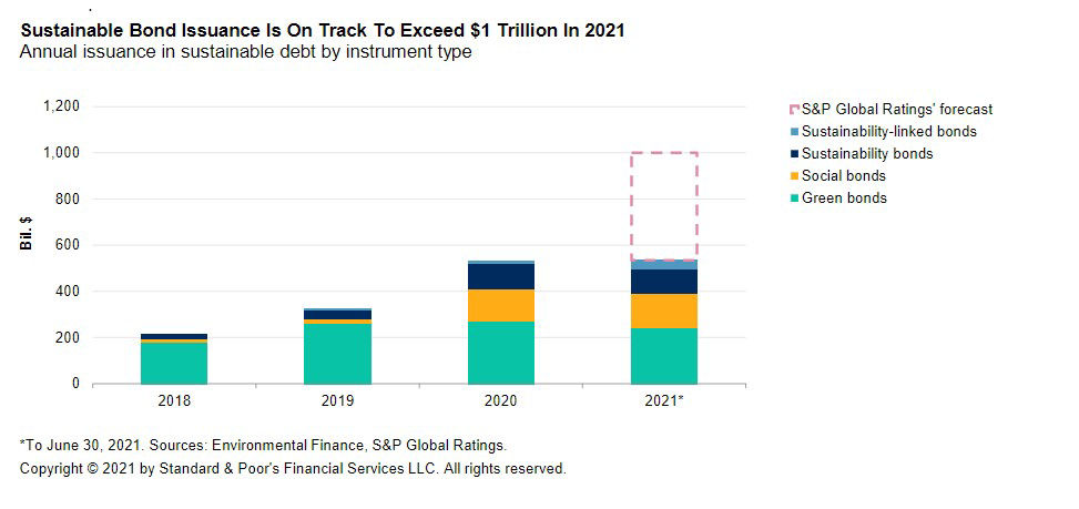 Green finance has grown exponentially over the last few years and appears poised to continue expanding. S&P Global Ratings, the ratings arm of S&P Global, predicts that sustainable bond issuance — including green, social, sustainability and sustainability-linked bonds — could collectively exceed $1 trillion in 2021.