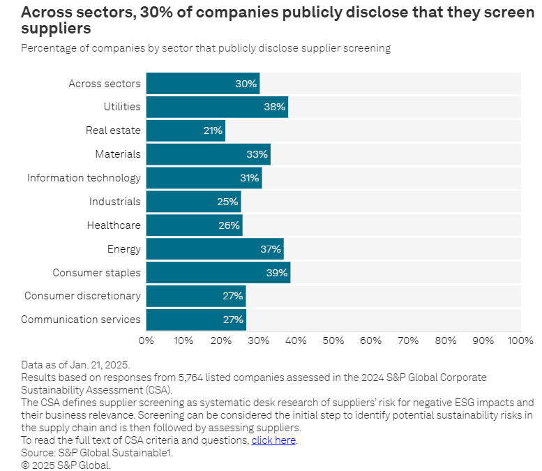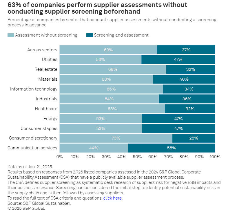 企业面临监管机构和投资者的压力,需要监控供应链中可能对运营或声誉造成负面影响的环境、社会和治理(ESG)风险。部分企业正在开展资源密集型的供应商评估,以识别潜在的可持续发展风险,但许多企业尚未实施供应商筛选这一前置步骤,难以精确锁定最需要进行评估的供应商。根据标普全球Sustainable1的数据显示,虽然有超过63%的企业在开展供应商评估,但广泛缺乏有效的筛选机制。
