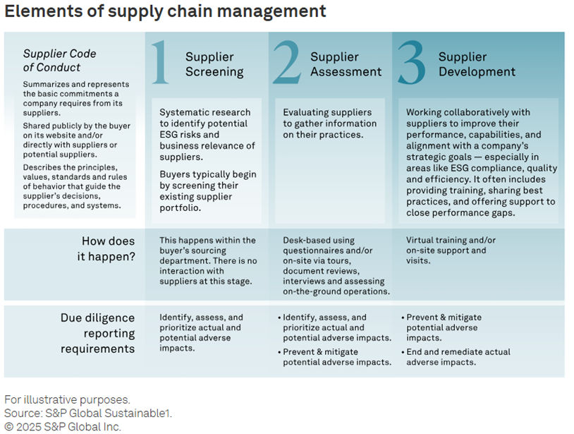 随着监管机构、可持续报告框架和投资者对供应链中潜在的环境和人权风险加强审查,成功且具有成本效益的供应商管理变得日益重要。近年来,欧盟通过《企业可持续性尽职调查指令》(CSDDD)和《欧盟森林砍伐法规》(EUDR)建立了重要的供应链风险监控和缓解规则。CSDDD为企业设定了尽职调查义务,要求其在上游和下游“活动链”中预防、终止或减轻对人权和环境的不利影响,涵盖供应、生产和分销环节。EUDR要求向欧洲市场销售特定产品或大宗商品的企业需证明这些产品并非来自新近毁林土地,且未造成森林退化。