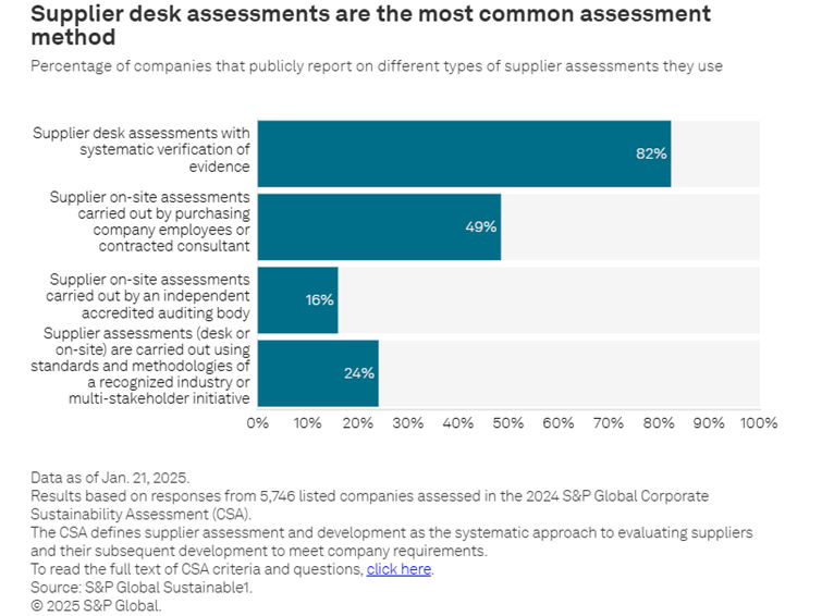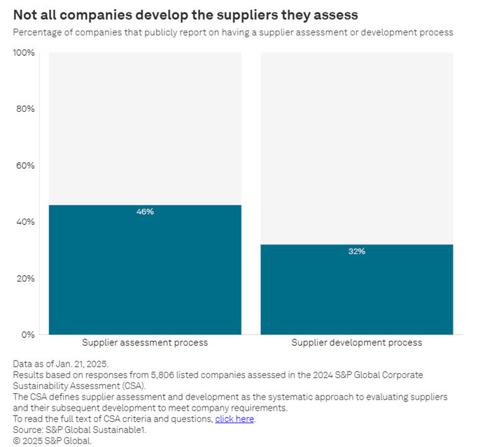 CSA数据显示,虽然46%的企业表示建立了供应商评估流程,但仅有32%的企业制定了正式的供应商提高改进工作流程。这14个百分点的差距表明,许多供应商虽然接受了评估,但因缺乏相关提高改进工作从而无法获得积极的支持或改善。这种脱节也凸显了对供应商网络进行广泛评估的潜在低效性,相比之下,更有效的做法是通过筛选识别出更可能对采购方构成可持续性风险的供应商——这些供应商最能从深度评估中受益。如果评估结果显示某供应商无需提高改进,这恰恰证实了更高效的筛选流程在一开始就能识别出此类情况。