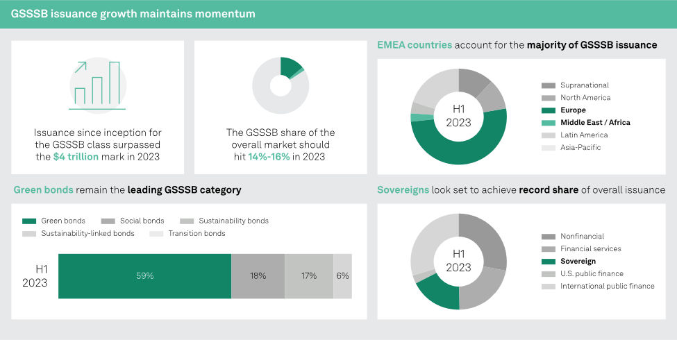 S &P Global Ratings recently published its midyear update for its global bond forecast for 2023 (see “Credit Trends: Global Financing Conditions: Market Resilience Supports Stronger-Than-Expected Issuance in 2023,” published July 26, 2023). Below, we provide our outlook for the green, social, sustainable, and sustainability-linked bond (GSSSB) market for the second half of the year. Additionally, we explore key drivers of issuance growth in the first half of the calendar year, broken down by sector and region. All 2023 figures are for Jan. 1 to June 30.