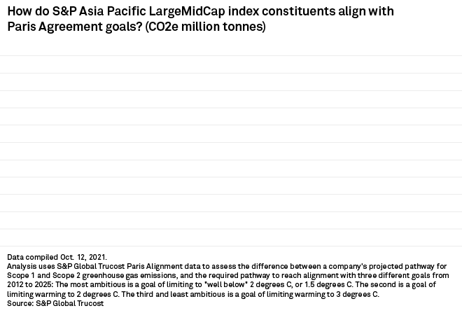 Cumulatively, the S&P Asia Pacific LargeMidCap is poised to miss the 1.5-degree mark by close to 9 billion carbon dioxide-equivalent metric tonnes — more than the S&P 500 and S&P Europe 350 combined.