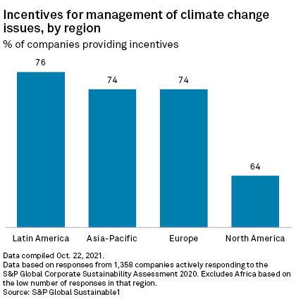 And indeed, some companies already link executive compensation to climate goals. Around three-quarters of companies in Latin America, Asia-Pacific and Europe that participated in S&P Global's 2020 Corporate Sustainability Assessment, or CSA, offer incentives for the management of climate change issues.