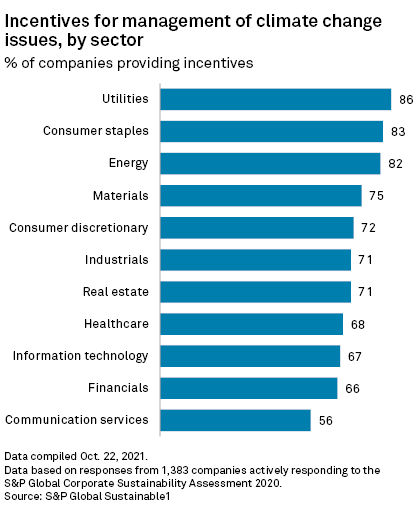 Some companies already have incentives for the management of climate issues. Our analysis found that 86% of global utility companies participating in the 2020 CSA provide incentives for the management of climate change issues — a higher percentage than any other sector. This was followed by the consumer staples sector (83%) and energy sector (82%).